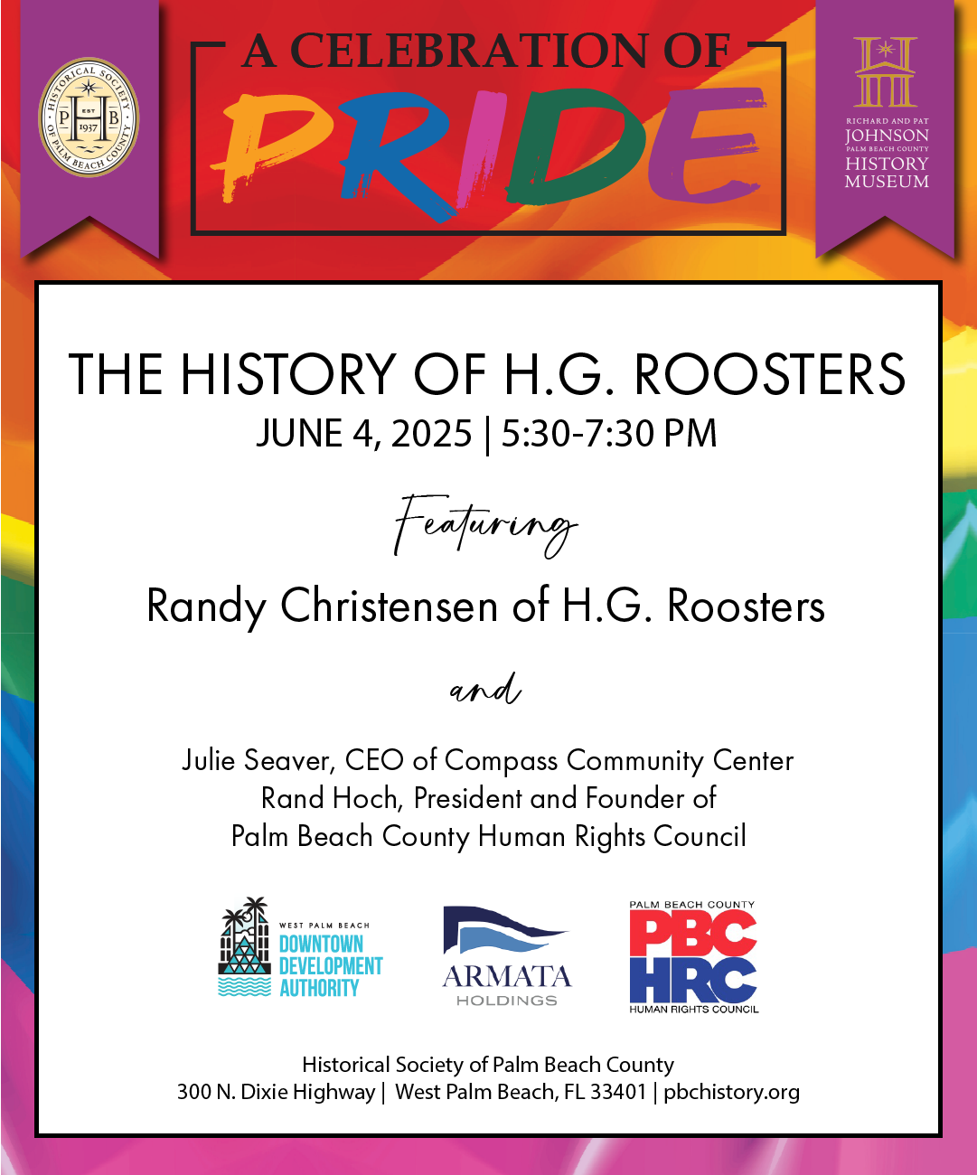 In addition to hearing about the history of Roosters from the bar’s owner’s business partner, Randy Christensen, the program will feature remarks from Julie Seaver, CEO of Compass Community Center, and Rand Hoch, President and Founder of the Palm Beach County Human Rights Council. Guests will also have the opportunity to view a special exhibition that charts Roosters’ history.